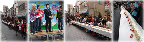 最初は宇都宮屋台横町「50mののり巻き作りに挑戦!」から始まった、中心市街地活性化を図るイベント。その長さは伸びに伸びて400mに。用意したロールケーキは約2500本。今回はJAさんの協力もあり、とちおとめ5000個も提供されました。
